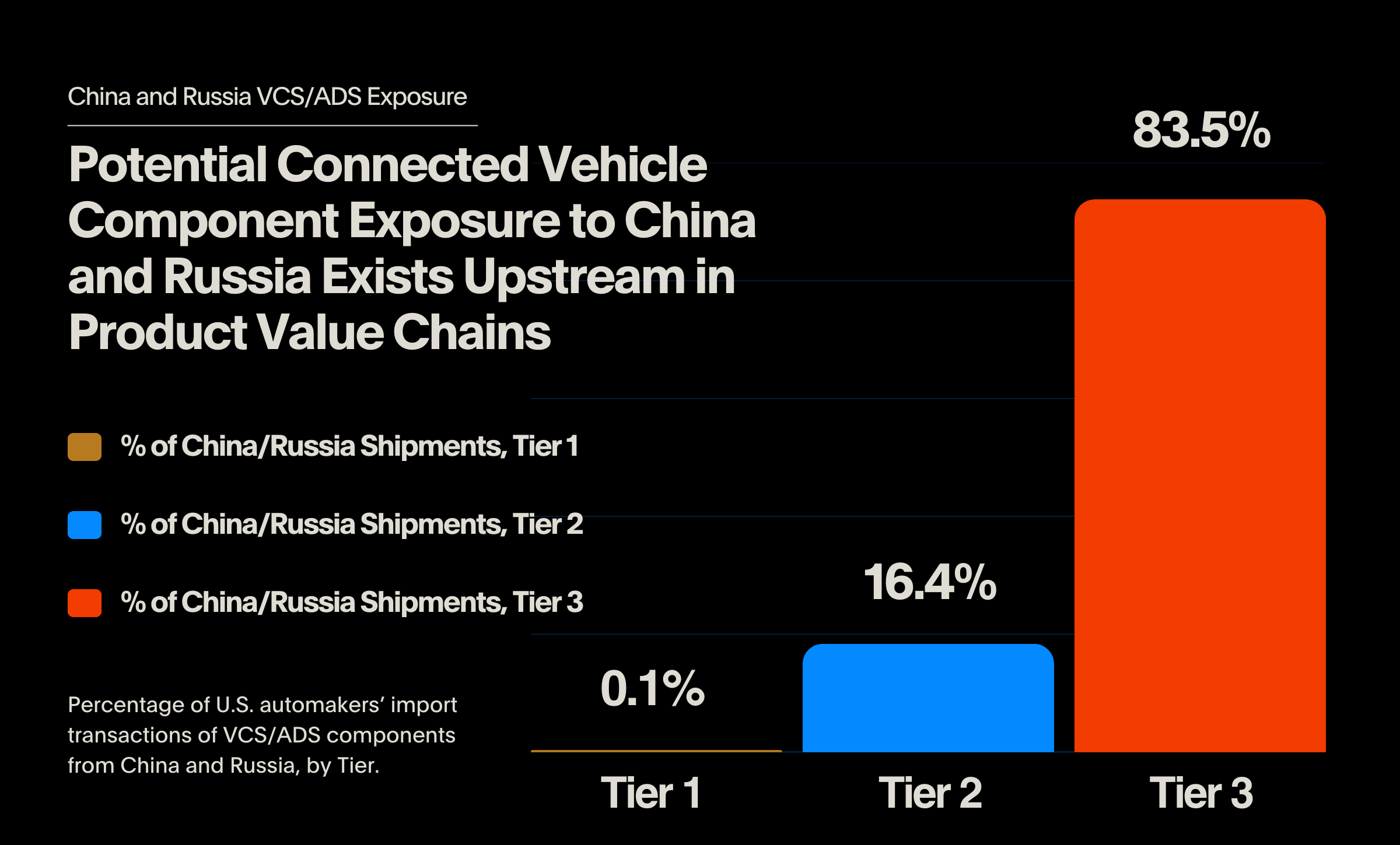 How far upstream is the potential exposure to Chinese and Russian components? 83.5% of the analyzed VCS/ADS component transactions occur at Tier 3 or beyond. Research from Gartner indicates that only 17% of organizations have substantial visibility into Tier 3 suppliers. Without vastly improved upstream visibility beyond Tier 1, identifying potential Chinese and Russian exposure and proving connected vehicle compliance is effectively impossible for auto manufacturers.