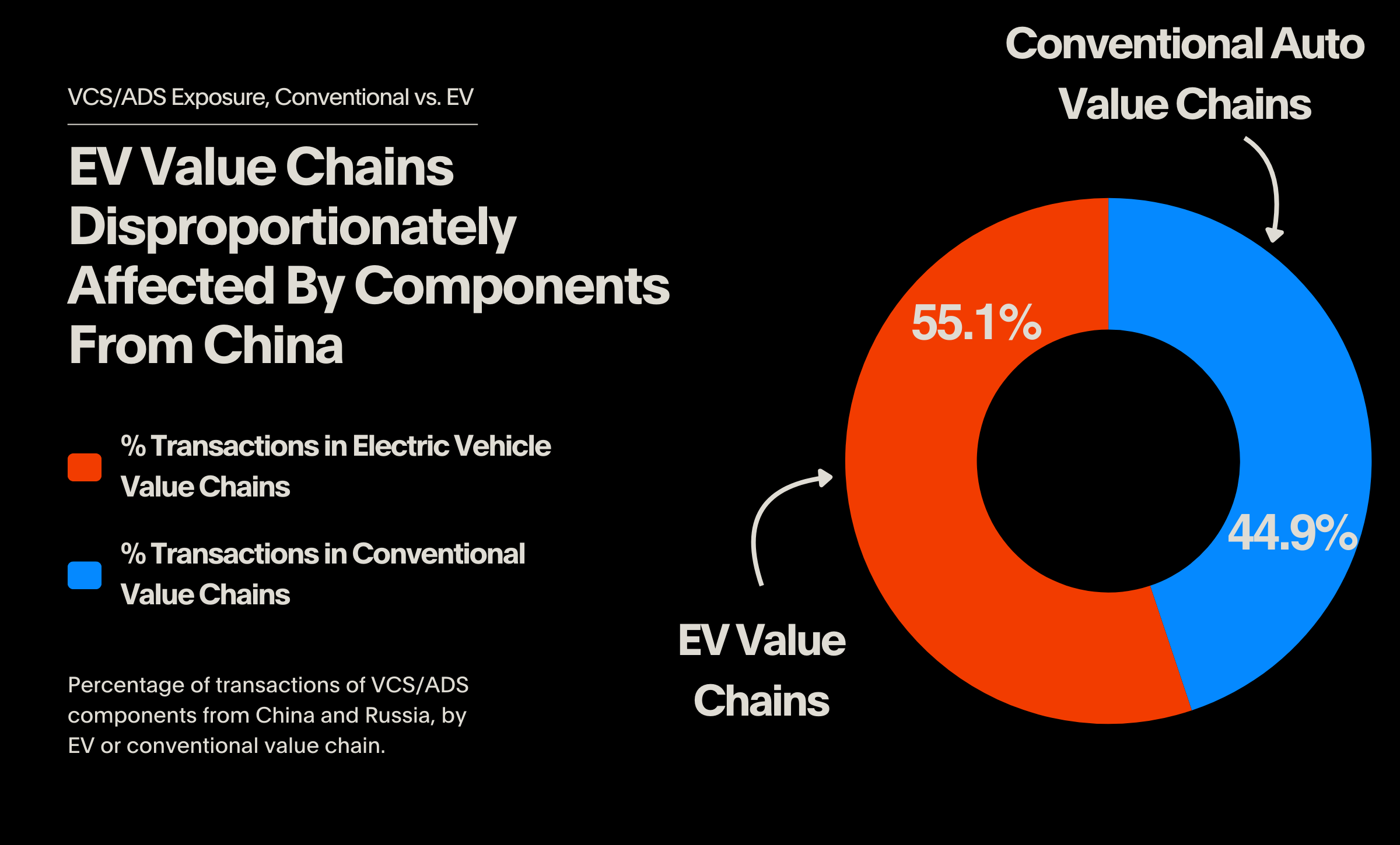 Of the 280,753 total transactions linked to China or Russia, 154,779 (55.1%) are part of an electric vehicle value chain; less than half are associated with value chains flowing into a conventional, gas-powered car.